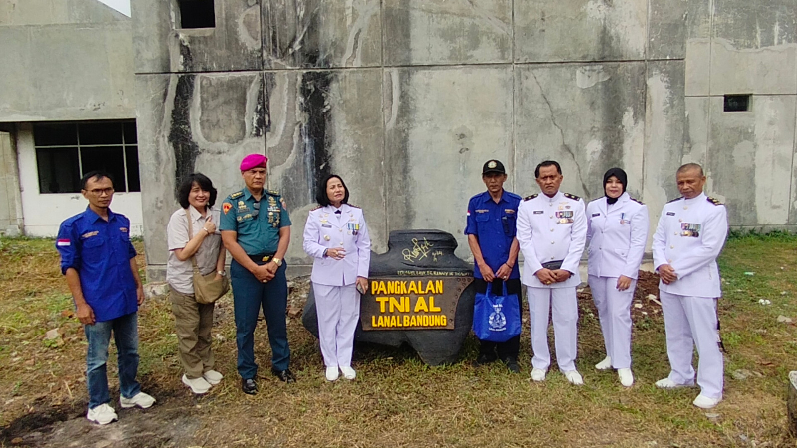 TNI AL, Bandung,– Dalam Rangka HUT Ke-79 TNI AL Tahun 2024, Pangkalan TNI Angkatan Laut (Lanal) Bandung dalam hal ini Komandan Lanal Bandung Kolonel Laut (KH/W) Dr. Renny Setiowati, S.T., M.Sc., M.Tr.Hanla., didampingi Palaksa, Pasintel, Paspotmar, PgS. Pasproga, Danunit Intel, dan PgS. Dansatma Lanal Bandung menerima cindera mata dan menandatangani Batu Prasasti yang dilaksanakan di Lapangan eks TVRI Cibaduyut No. 269 Kota Bandung, Selasa (10/09/2024).