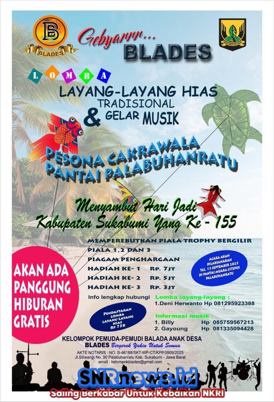 Dalam rangka Hari Jadi Kabupaten Sukabumi, pantai Muara Citepus akan menjadi saksi semangat anak muda yang berkibar di langit dan bergema di panggung. Perkumpulan pemuda BLADES mempersembahkan Festival Layang-Layang & Parade Band Karya Anak Sukabumi, sebuah perayaan budaya dan inovasi lokal yang digelar Sabtu pukul 13.00 WIB. Tak hanya menjadi ajang ekspresi, acara ini juga menghadirkan kompetisi berhadiah jutaan rupiah bagi para pemenang terbaik.