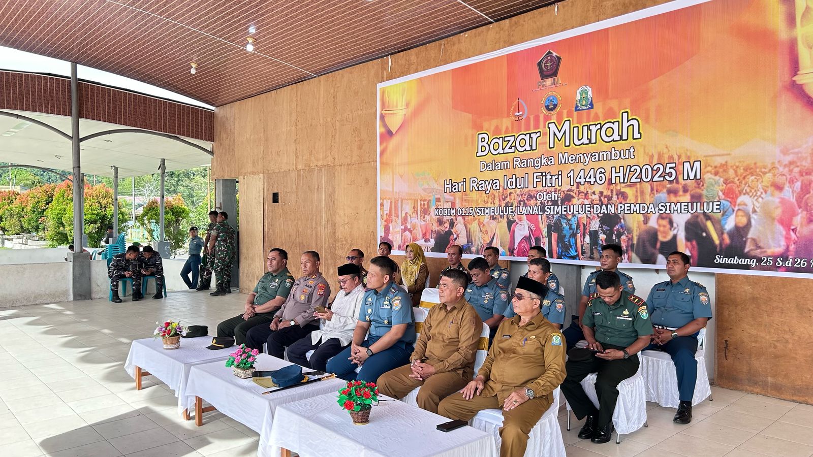 TNI AL, Simeulue,- Dalam rangka menyambut Hari Raya Idul Fitri 1446 H/2025 M, Pangkalan TNI AL Simeulue berkolaborasi bersama Kodim 0115/Simeulue dan Pemerintah Daerah menggelar kegiatan Bazar TNI yang bertujuan untuk membantu masyarakat mendapatkan kebutuhan pokok dengan harga terjangkau, Selasa (25/3/2025).