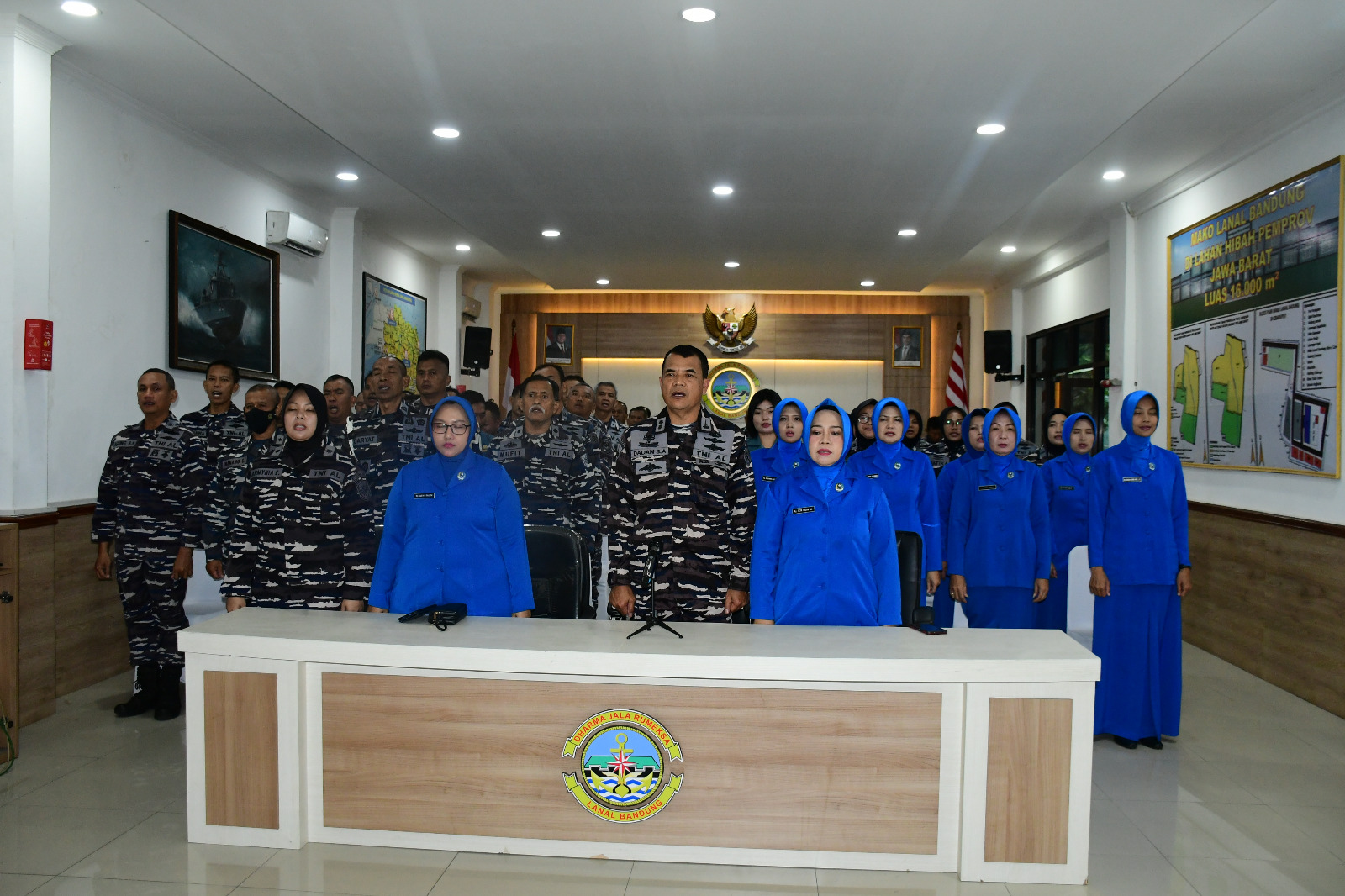 TNI AL, Bandung,- Prajurit Pangkalan TNI Angkatan Laut Bandung beserta PNS dan Pengurus Cabang 9 Korcab III DJA I mengikuti Pengarahan Pangkoarmada RI Laksamana Madya TNI Dr. Denih Hendrata, S.E., M.M., CHRMP., secara virtual, bertempat di Aula Mako Lanal Bandung, Jalan Aria Jipang No. 8 Kota Bandung, Senin (17/03/2025).