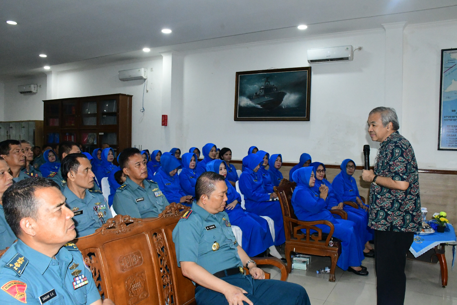TNI AL, Bandung,- Komandan Lanal Bandung Kolonel Laut (P) Muhammad Taufik, M.Tr.Hanla., M.M., didampingi Ketua Cabang 9 Korcab III Daerah Jalasenastri Armada I beserta Prajurit dan Keluarga Besar Pangkalan TNI AL (Lanal) Bandung mendapat Ceramah Motivasi dari Pakar Komunikasi dan Motivator Profesional Dr. Aqua Dwipayana di Mako Lanal Bandung, Jalan Aria Jipang No. 8 Kota Bandung, Rabu (13/11/2024).