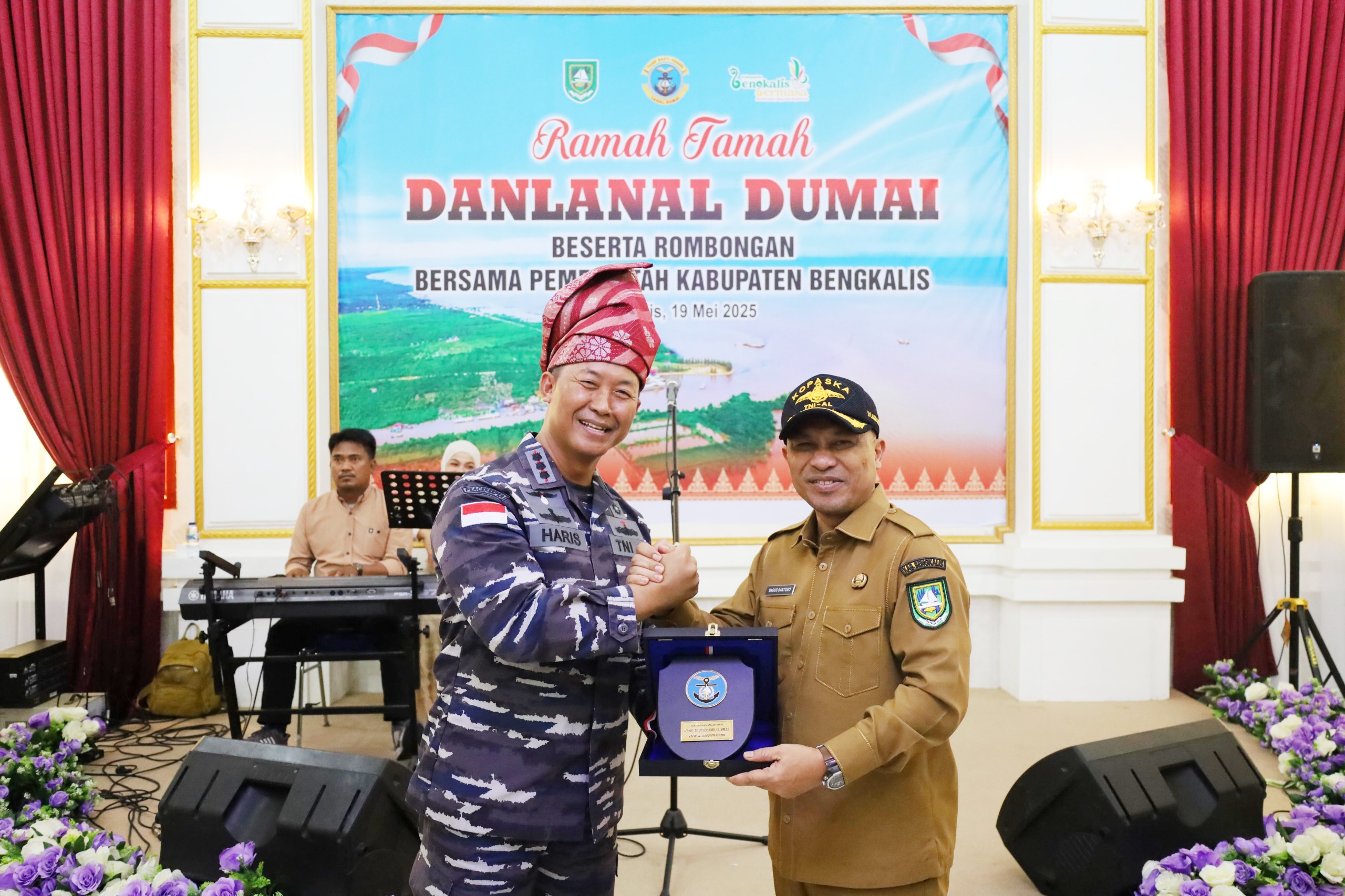 TNI AL, Bengkalis,- Hangat dan penuh penghormatan, Wakil Bupati Bengkalis Dr. H. Bagus Santoso bersama Forkopimda Kabupaten Bengkalis sambut kedatangan Danlanal Dumai Kolonel Laut (P) Abdul Haris S.E., M.M.D.S., beserta rombongan. Dengan tradisi khas tabuhan kompang serta pemasangan tanjak, Danlanal Dumai disambut di Wisma Daerah Sri Mahkota Bengkalis, Senin (19/5/2025).
