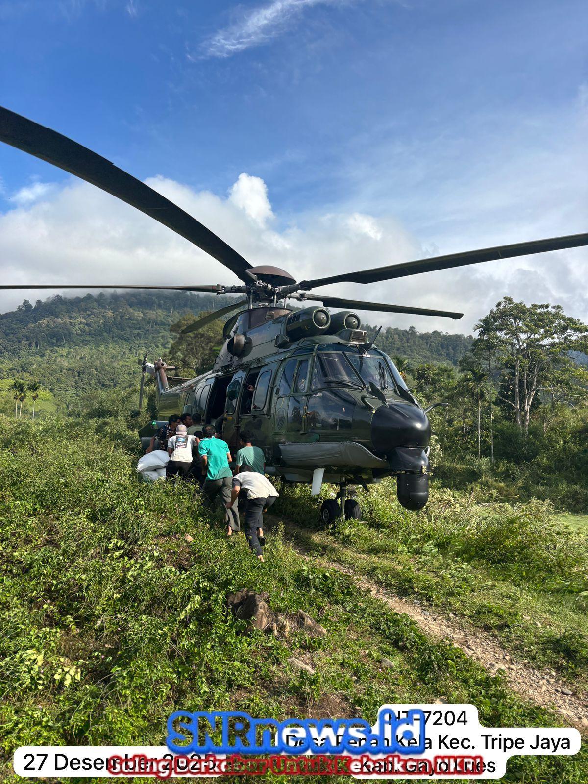 Snrnews.id, Aceh — TNI Angkatan Udara (AU) kembali menerjunkan dua helikopter untuk mendistribusikan bahan pangan di lokasi terdampak bencana banjir bandang dan longsor di Aceh, Sabtu (28/12). Dua unit helikopter tersebut mengangkut logistik ke tujuh desa di tiga kabupaten yang tersebar di provinsi tersebut.